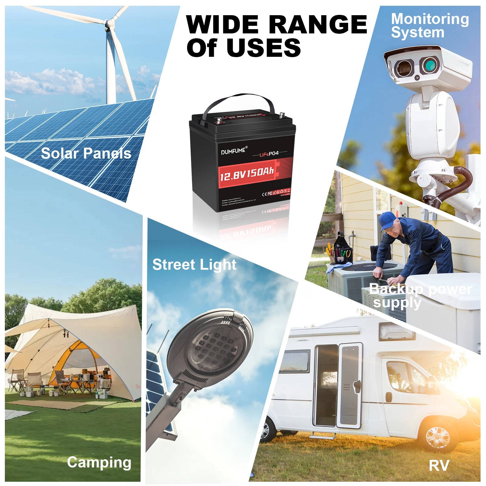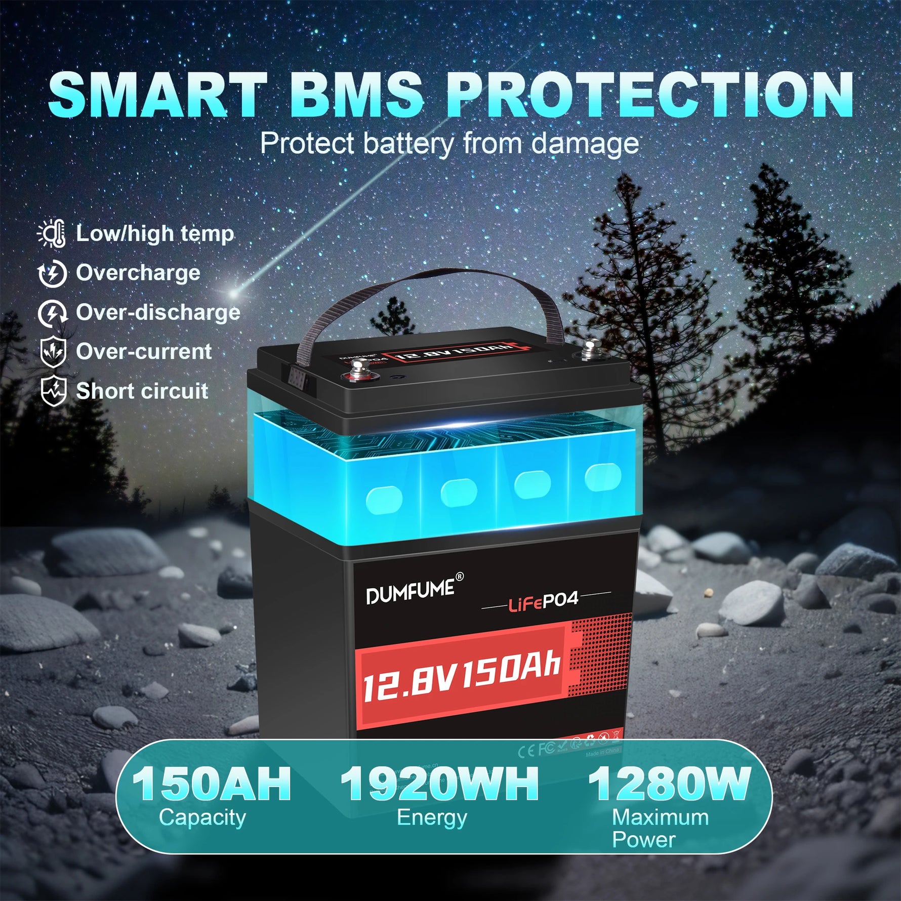 Dumfume 12V 150Ah Max Deep Cycle Rechargeable LiFePO4 Battery for RV Solar Marine Solar Panel Camping