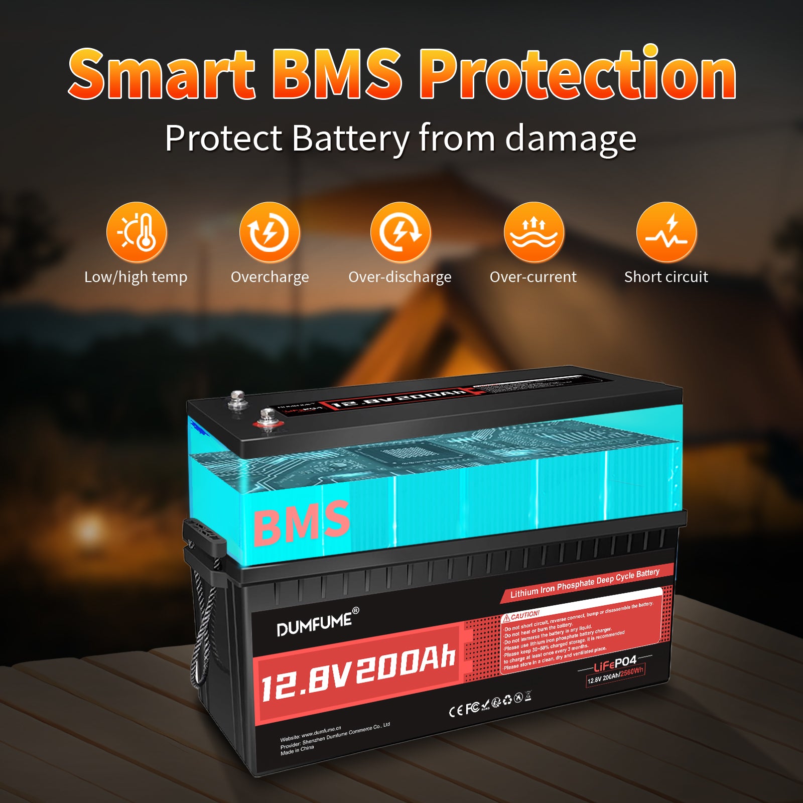 Dumfume 12V 200Ah Deep Cycle Rechargeable LiFePO4 Battery for RV Solar Marine Solar Panel Camping