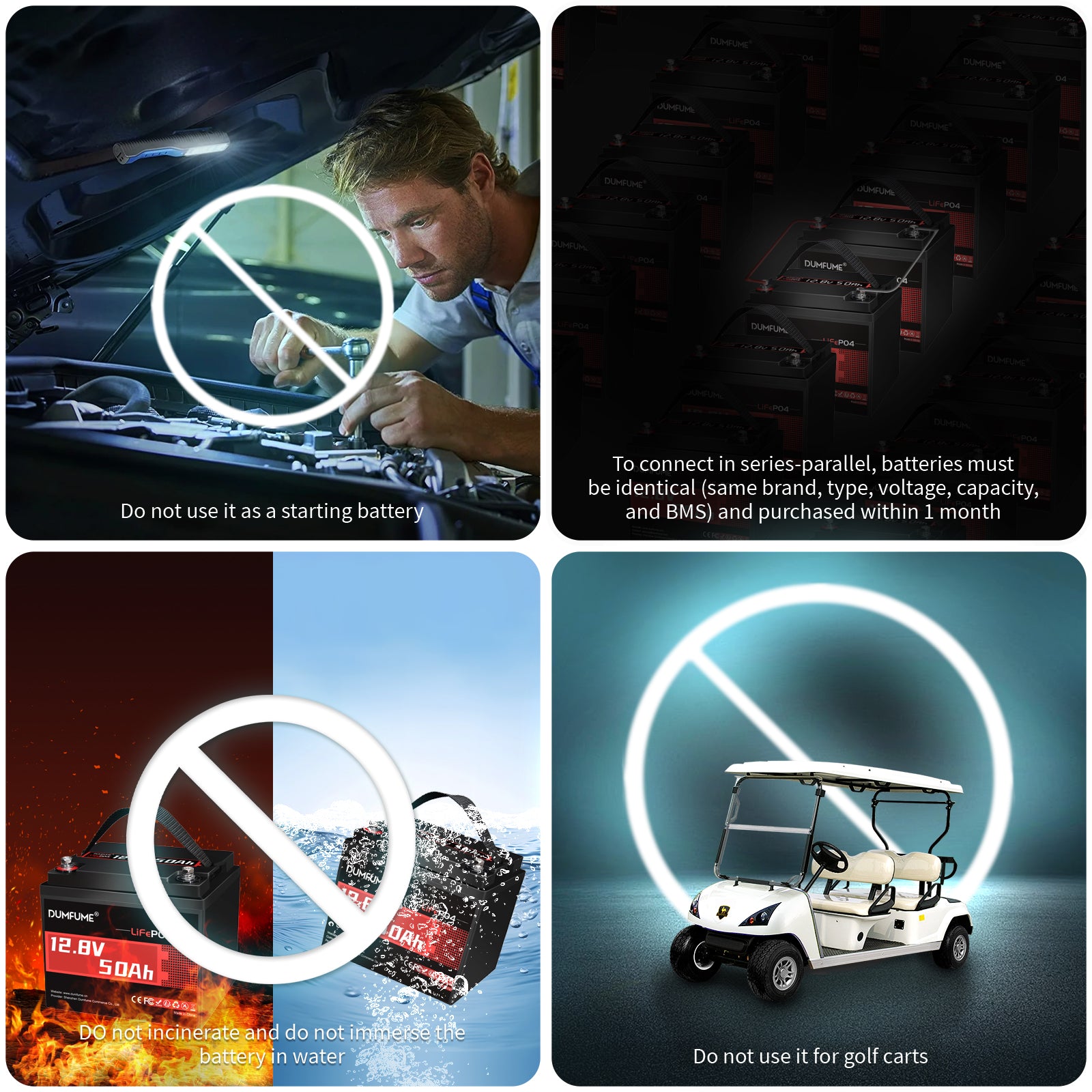No. These batteries are designed for energy storage only. Do not use them for starting devices, golf carts, or jacks.