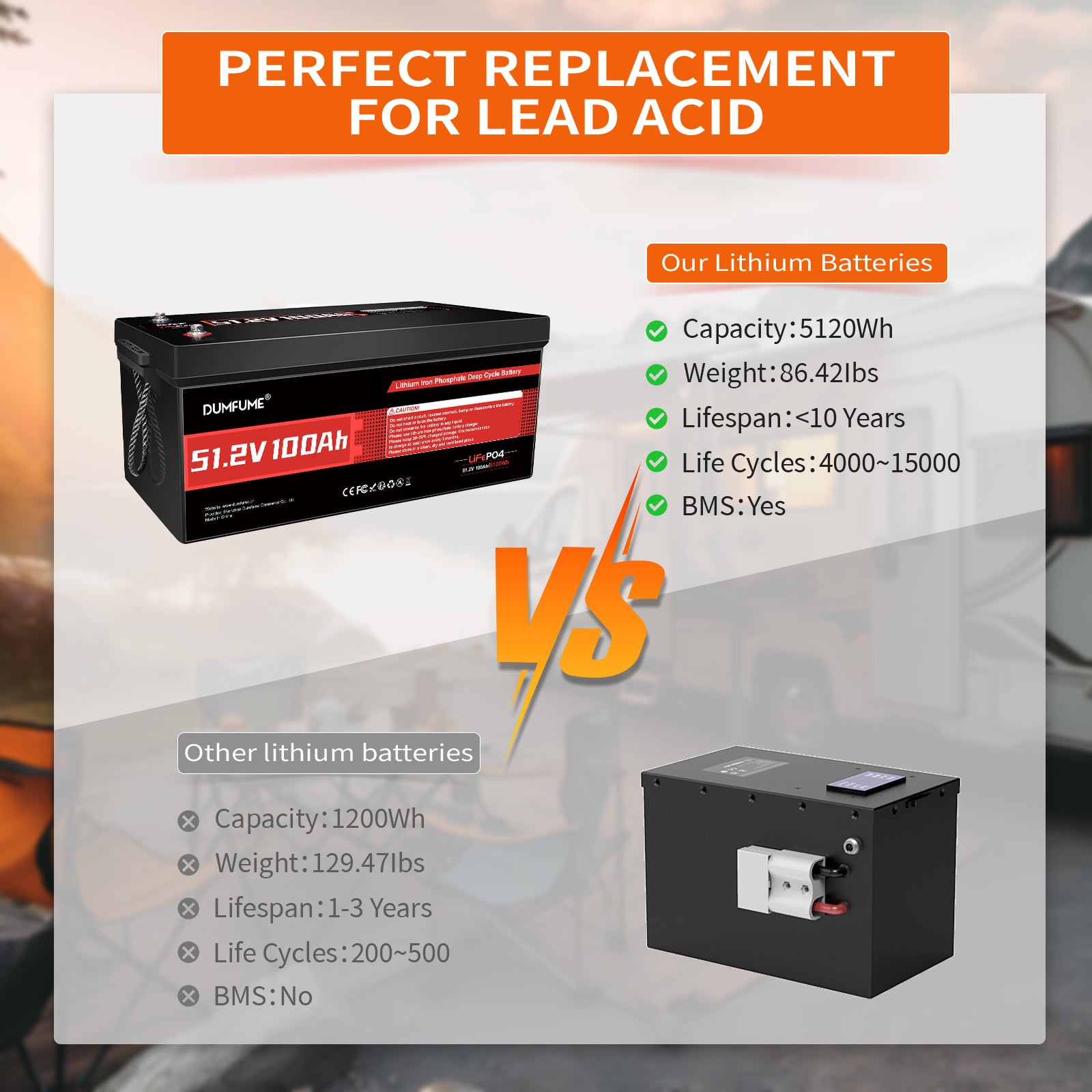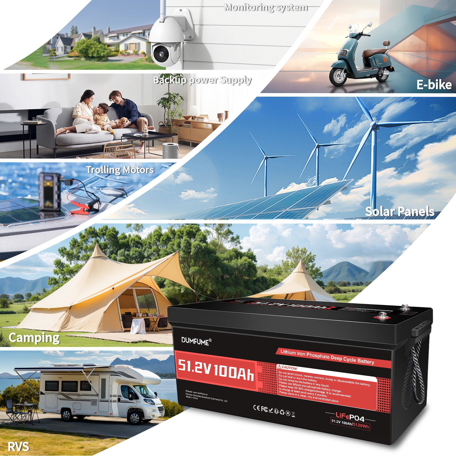 Dumfume 48V 100Ah Deep Cycle Rechargeable LiFePO4 Battery for RV, Solar, Marine, Camping, Off-Grid, Home Energy Storage, Golf Carts